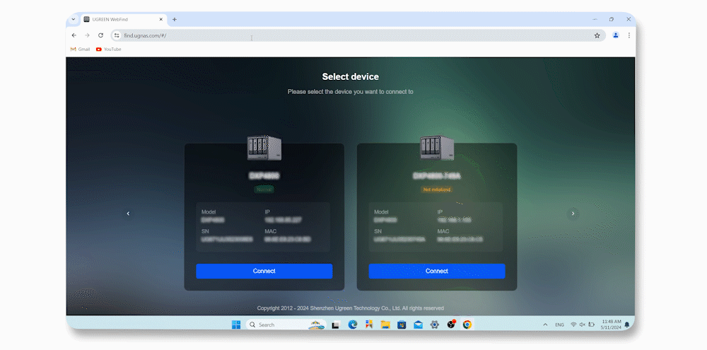 Ensure that the NASync device and computer are on the same LAN network. Visit the URL: find.ugnas.com and the system will automatically search and display the devices in your current LAN. Just select the device you want to add and click "Connect" and your NAS device will be added successfully.
