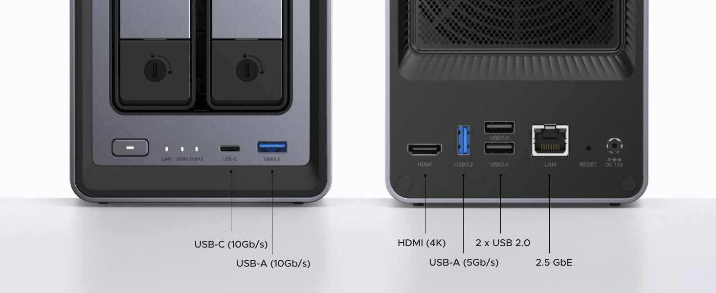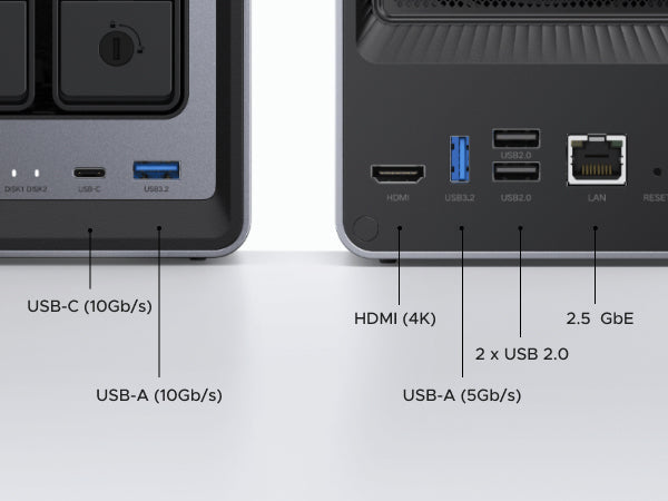 Back up 1GB in mere seconds using the high-speed 2.5GbE network port or one of the 10Gbps USB ports. Significantly faster than the 1GbE ports found on comparable NAS devices.