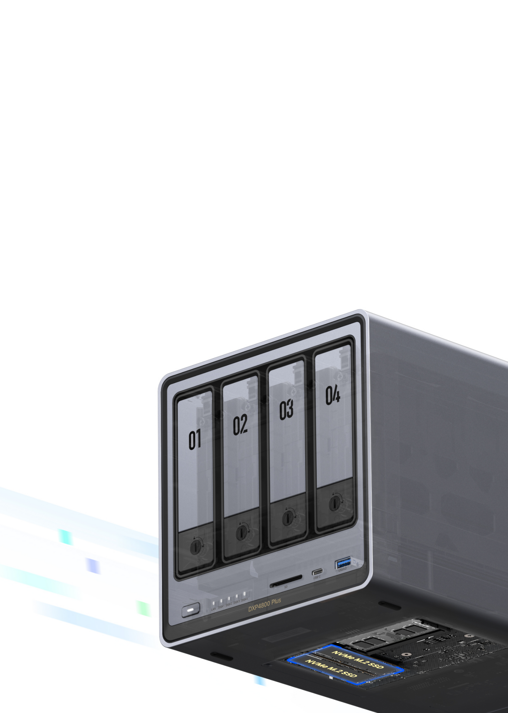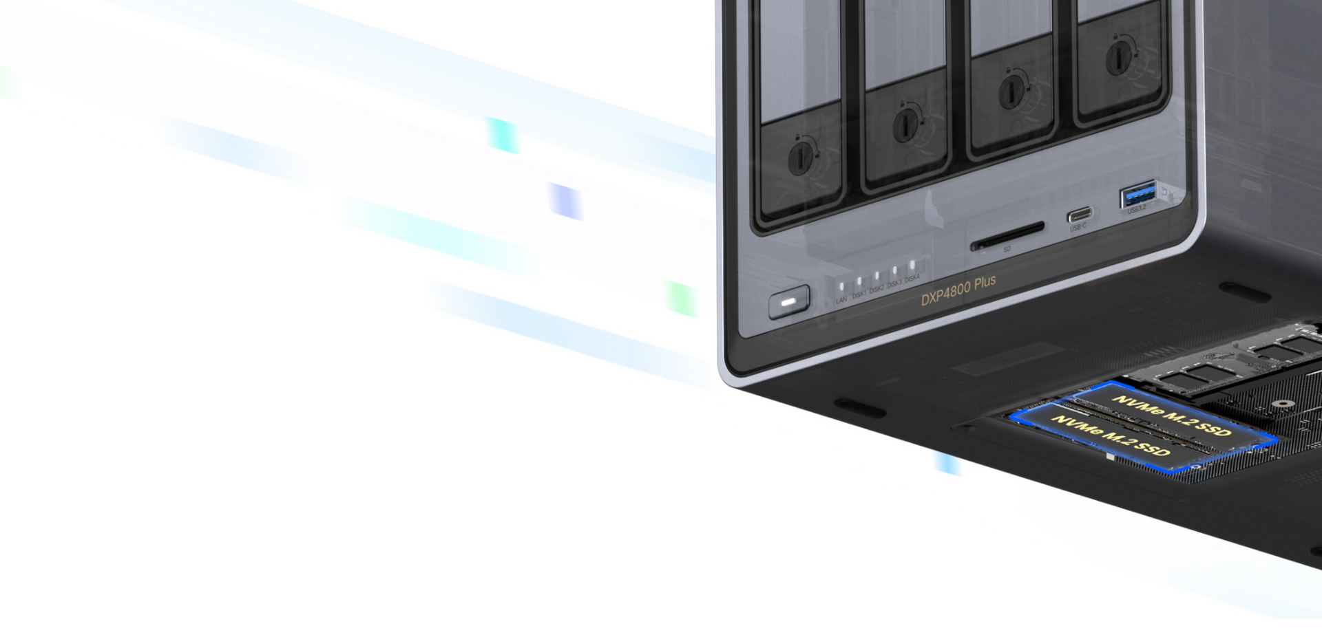 NASync features two M.2 NVMe slots for high-speed SSDs, significantly boosting read and write speeds for enhanced performance.