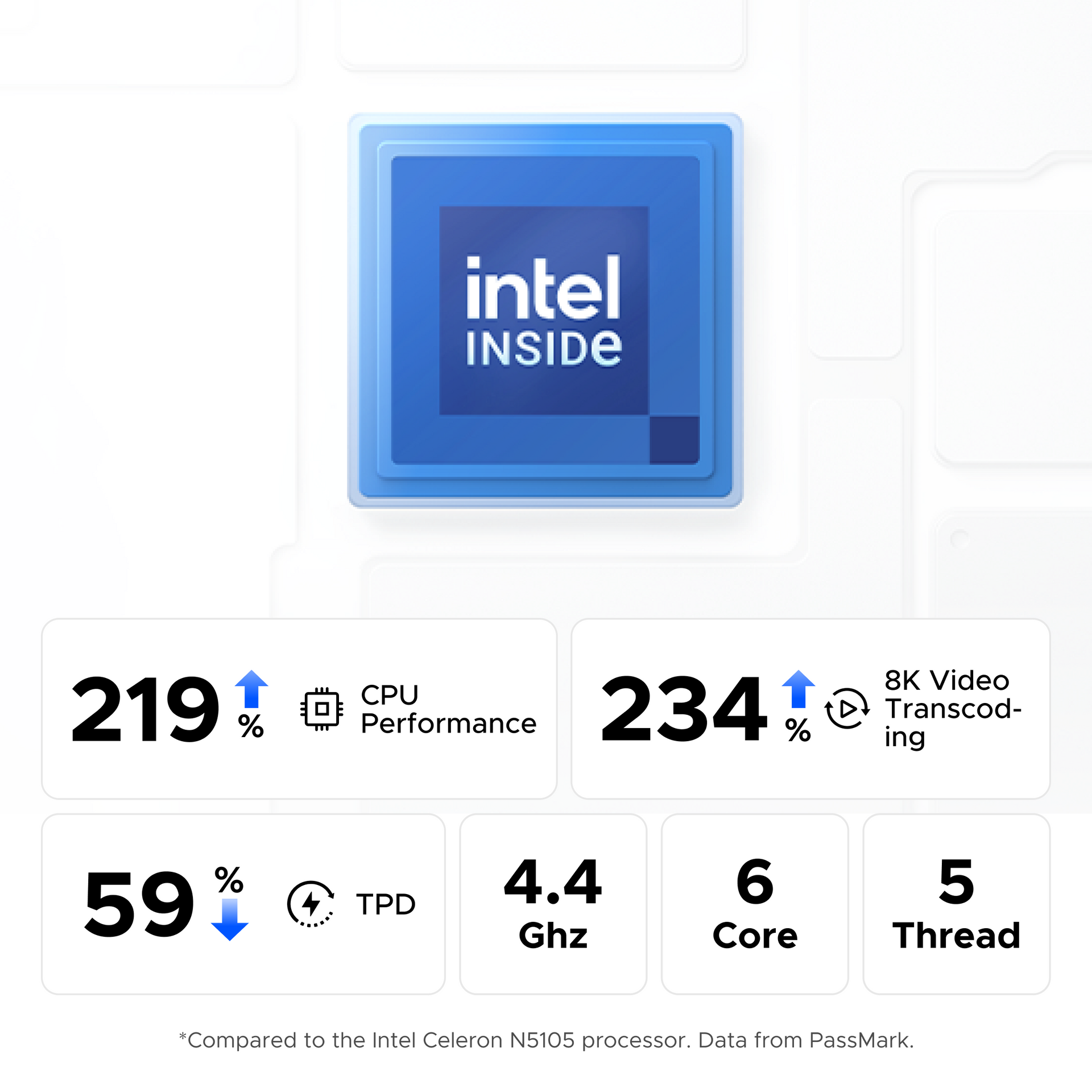 Powered by the 12th Gen Intel Pentium Gold Processor 8505, it delivers powerful performance for NAS multitasking while keeping power consumption low, ideal for 24/7 use.